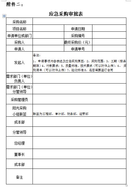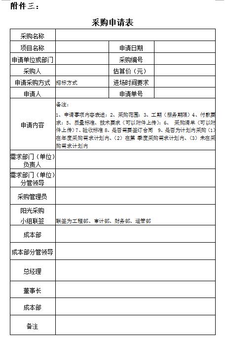 2.工作流程:需求部門(單位)提報(bào)《采購申請表》,按規(guī)定程序?qū)徟ㄟ^后,由成本部委托招標(biāo)代理機(jī)構(gòu)具體實(shí)施。