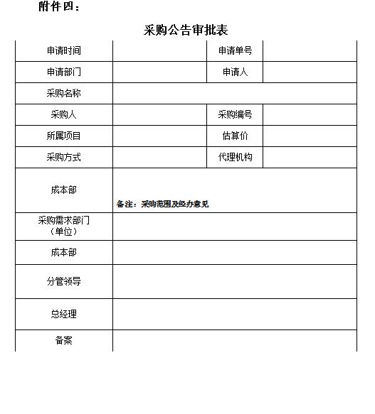 3.工作流程:需求部門(單位)提報(bào)《采購申請表》,按規(guī)定程序?qū)徟ㄟ^后,由成本部委托招標(biāo)代理機(jī)構(gòu)具體實(shí)施。
