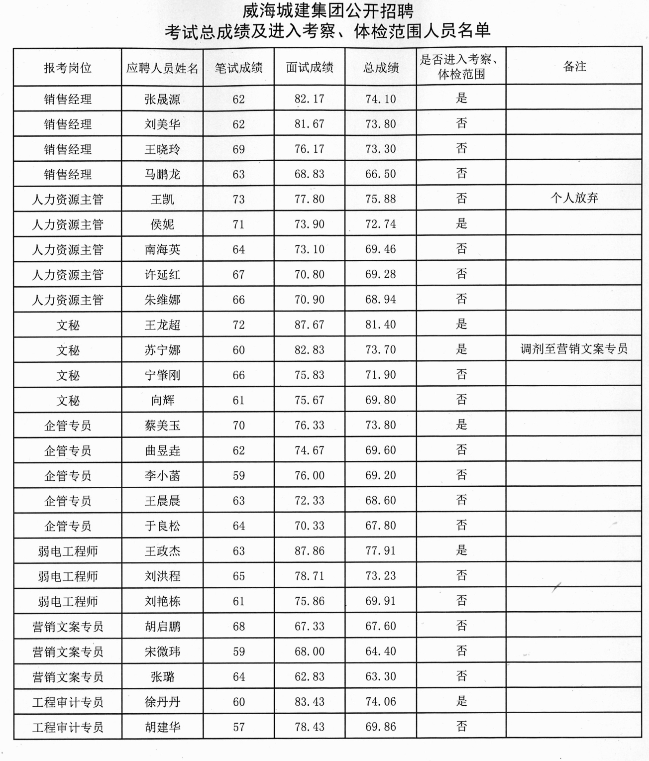 威海城建集團(tuán)公開招聘考試總成績及進(jìn)入考察、體檢范圍人員名單 :